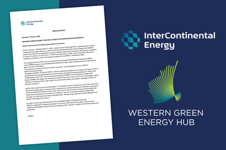 Global interest for Australian green fuels accelerates. Perth, Australia – Monday March 2, 2026 – InterContinental Energy (ICE), a global leader in large-scale green hydrogen projects, confirms that its landmark Western Green Energy Hub (WGEH) project has secured enough green…