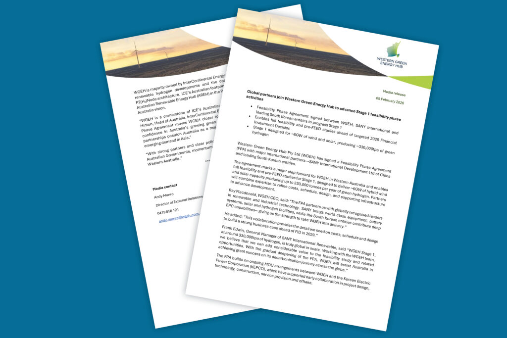 Western Green Energy Hub Pty Ltd (WGEH) has signed a Feasibility Phase Agreement (FPA) with major international partners—SANY International Development Ltd of China and leading South Korean entities.